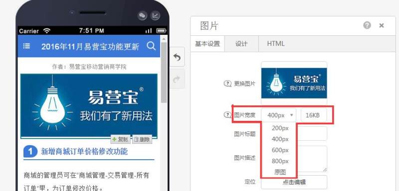 设计人员可在图片控件属性里选择图片的宽度和质量,并且系统对上传图片规格、容量大小错误新增了提醒功能。